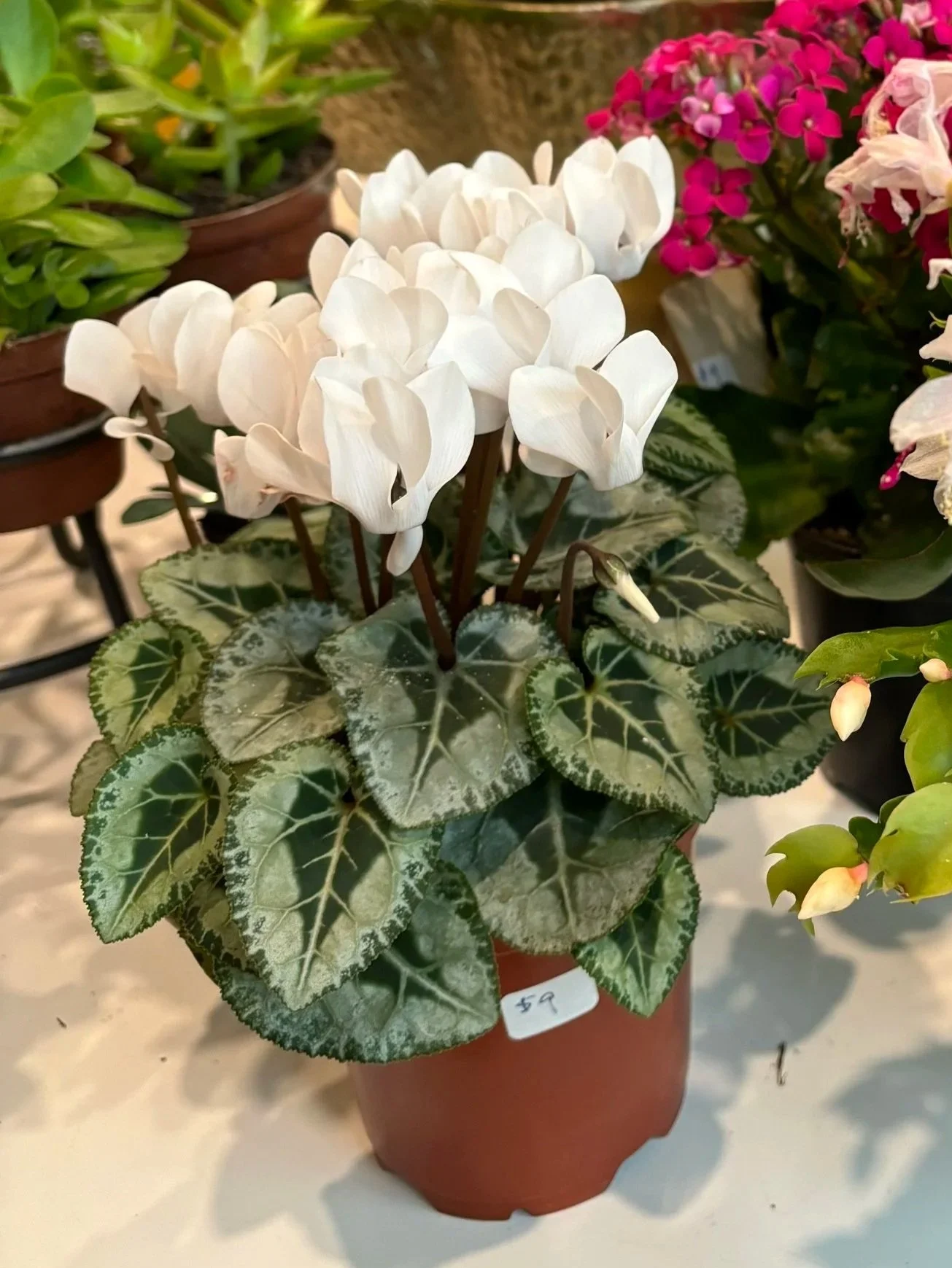 Trick: If your cyclamen wilts even when watered, it’s likely too warm. Move it somewhere cooler, and it will perk back up. It is also forgiving when you forget to water, and the leaves become very dramatic, drooping as if you left it for a month! Water will bring it back to health.